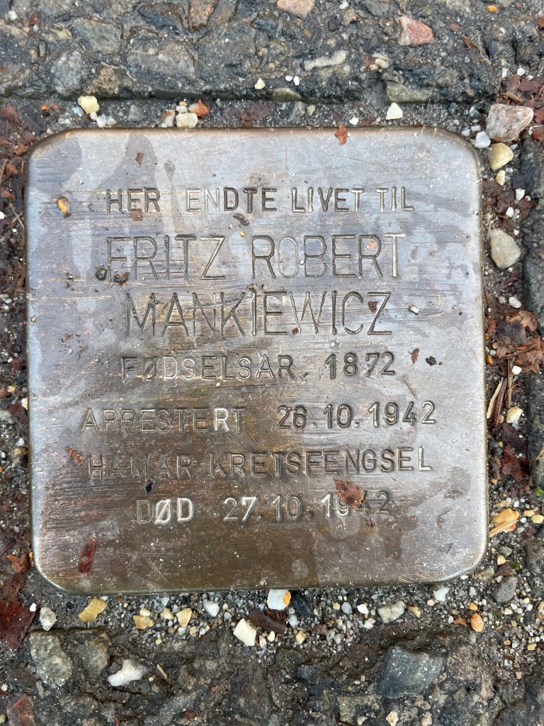 The only stolpenstein in Hamar commemorates Fritz Robert Mankiewicz. Born in Posen, Prussia in 1872. On the night of his arrest, October 26th, he suicided in Hamar prison. A german jew, who was Oberamtmann and leader of the agricultural-union in Schleswig Holstein, during his career. Mankiewicz arrived a refugee in Norway from Berlin in 1939. The family had to pay bail of 5000 Norwegian kroner for his refuge as Norwegian authorities at the time did not perceive racially or ethnicly based persecution as a valid reason for entry.